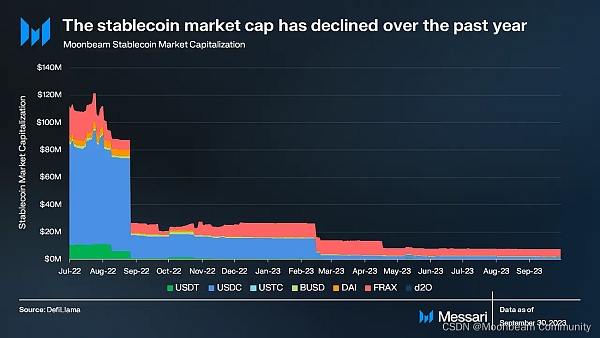 截至本季度末,Moonbeam稳定币市值为800万美元,在公链中排名第40位。原生Frax的市值为500万美元,占Moonbeam稳定币总市值的70%。波卡在本季度引入了对USDC的原生支持,随着Moonbeam开发支持市场,这可能会提升USDC的影响力。重要的是,由于Nomad漏洞事件,Moonbeam的稳定币市值在2022年8月下旬发生了急剧下降。
