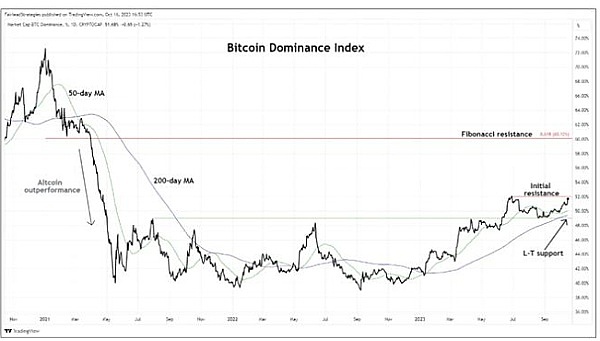 Fairlead Strategies 进行的技术分析显示,BTC.D 图表的上涨势头有望扭转,扭转 2021 年 3 月至 4 月牛市期间从 60% 降至 40% 的跌幅。投资者导致比特币在比特币市场上的主导比例下降。在此期间,他们将资金从相对昂贵的比特币转移到山寨币。