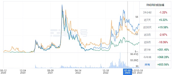 看到上图,咱们可以看出菲尔币RNDR代币在24小时中涨幅为-1.22%,24小时中成交量为4889.39万,24小时成交额为6.55亿。