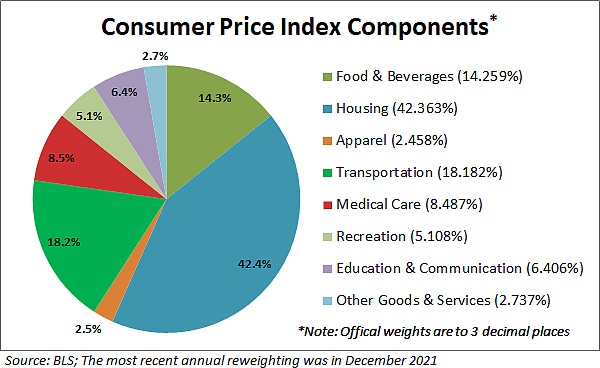 然后,CPI 数据统计部门会给予不同类别商品以不同的权重,权重是根据消费者购买这些商品或服务的比重来决定的,消费占比越高,在 CPI 中所占的权重也就越高。