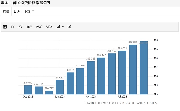 例如,2022年10月的 CPI 指数数据为 298.012,刚公布的 2023年9月份的 CPI 指数数据为 307.789。