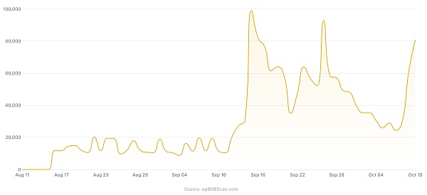 目前,opBNB 恰逢满月。在一个月的时间里,这个新生的链取得了怎样的成绩?链上浏览器显示,目前 opBNB 已经进行了超过 1033 万笔交易,并拥有超过 60 万地址数量。已经部署了超过 6400 个 BEP 20 代币。而日活地址数量一度触达峰值 9.9 万。