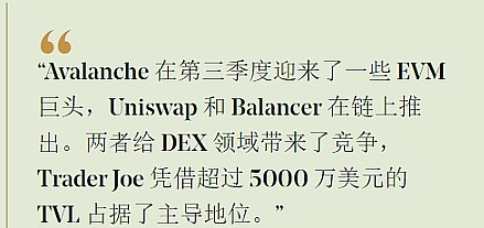 此外,在Avalanche网络上以美元计价的交易费用在第三季度也有所下降。不过,以AVAX计算,第三季度支付的费用比去年第四季度增长了61%。
