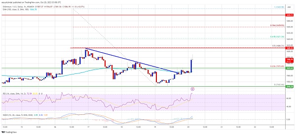 此外,以太坊目前的交易价格也高于1,565美元和100小时简单移动平均线。然而,价格在接近1,600美元附近面临阻力。
