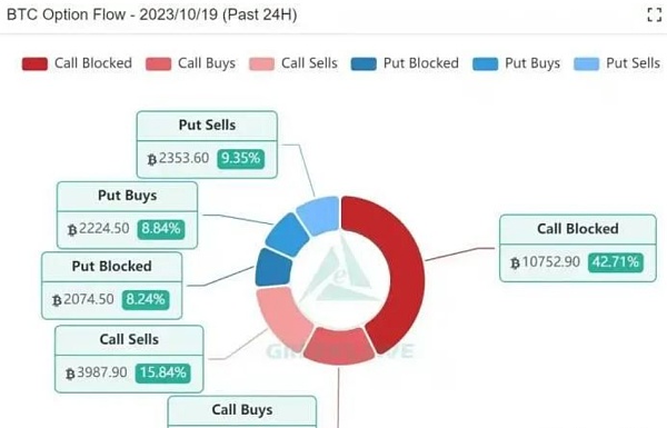 此外,比特币期权数据清晰反映出多头市场信心的增强。据期权市场数据显示,人们对比特币未来的价格长期上涨有越来越强烈的信心。今天,已经有超过10,000个BTC期权合同被交易,其总价值接近30亿美元,占当天期权市场总交易额的40%以上。根据GreeksLive提供的数据,主要的交易策略包括卖出BTC-3NOV23-29000-C期权和买入BTC-29DEC23-34000-C期权,形成对角价差。