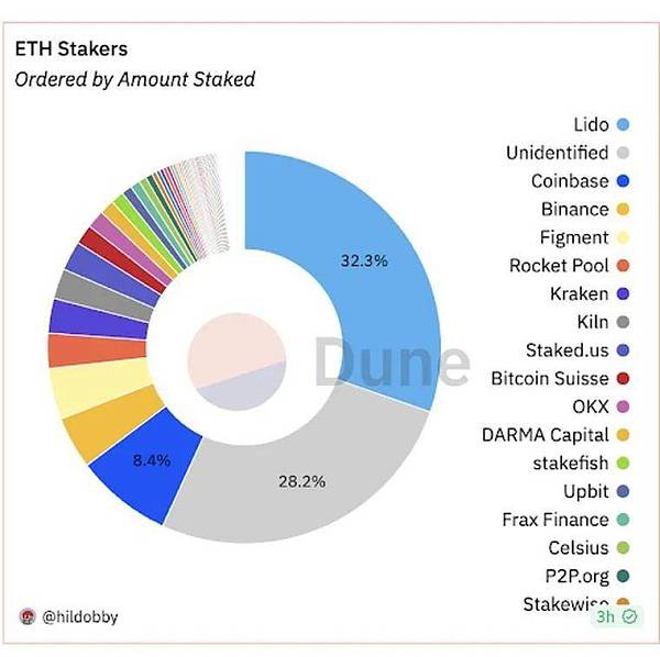 这种情况似乎正在上演,目前,最大的质押提供商是去中心化质押池 Lido。Lido 占质押ETH总份额的 32.3%,接近 33% 大关时引发了人们对中心化程度的担忧,开发人员称如果突破 33% 这一阈值可能会导致安全问题。