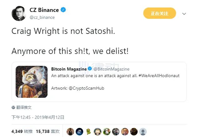 「Craig Wright is not Satoshi.Anymore of this sh!t ,we delist!」CZ 亮出了狠话。这一Twitter 吸引了许多注意力,CZ 的这一行为被描述为「威胁下架BSV」。