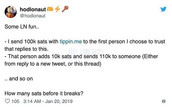 在Craig Wright 声称自己是中本聪的同时,当时的加密圈正传播着「比特币闪电火炬传递」的实验,通过闪电网路传送100000 聪(最小的比特币单位,等于0.001 个比特币)的比特币交易。然后,此交易的接收方将增加10000 聪并将其传送给下一个参与者,依此类推。如果火炬在失败之前包含的金额比去年更大,那么表明网路已经成长了。