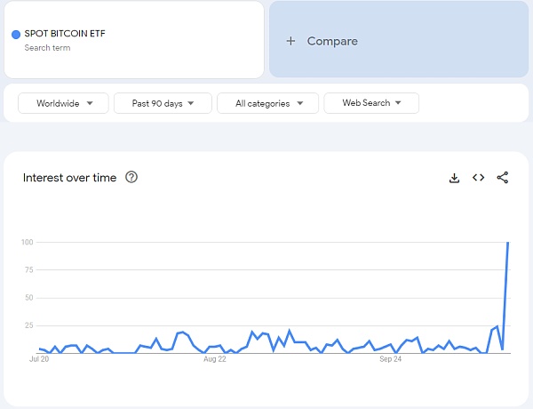 整个行业以及一些知名公司都在比特币的现货交易所交易基金上投入了大量资金。“现货比特币ETF”的全球谷歌搜索量接近五年来的最高点,清晰地表明了公众对这些投资工具的热情与日俱增。加密货币行业的意识提高和参与度的增加也在在线搜索的激增中得到反映。