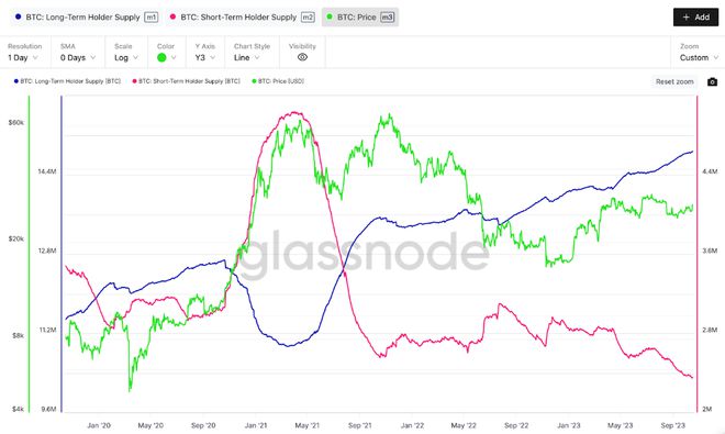 根据Glassnode获得的关键数据点,当 2021 年 11 月比特币价格达到 69,000 美元的峰值时,长期持有者拥有 1100 万比特币,而短期持有者的供应量为 500 万比特币。