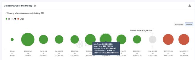 尽管如此,如果比特币价格反转至 25,000 美元以下,空头可能会使这一看涨预测失效。然而,该图表显示,627 万个地址以 26,750 美元的最高价格购买了 247 万枚代币。