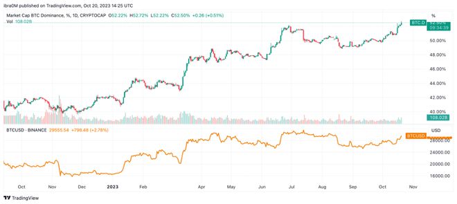 下图显示,10 月 7 日危机爆发时,比特币的加密货币市场份额为 51%。在紧张局势升级两周后,比特币取得了更多进展,10 月 20 日 BTC.D 升至 52.71%。