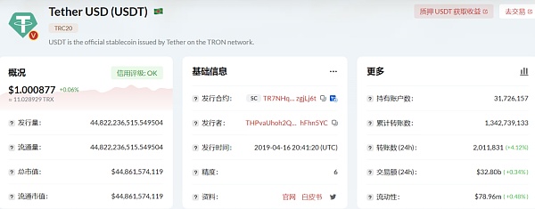 区块链浏览器TRONSCAN数据显示,Tether于10月19日在波场网络增发10亿枚USDT。目前,TRC20-USDT发行量超448.2亿枚,持有账户数超3100万。