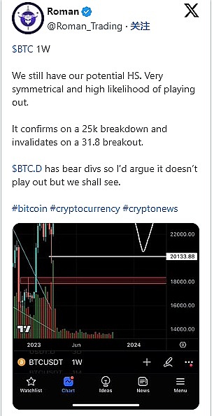 尽管作为主导加密货币的比特币在过去一周上涨了11%,重新将MicroStrategy的46亿美元投资转为绿色,但一些交易员已经发现了头肩形态的出现,这可能导致另一个下行趋势。