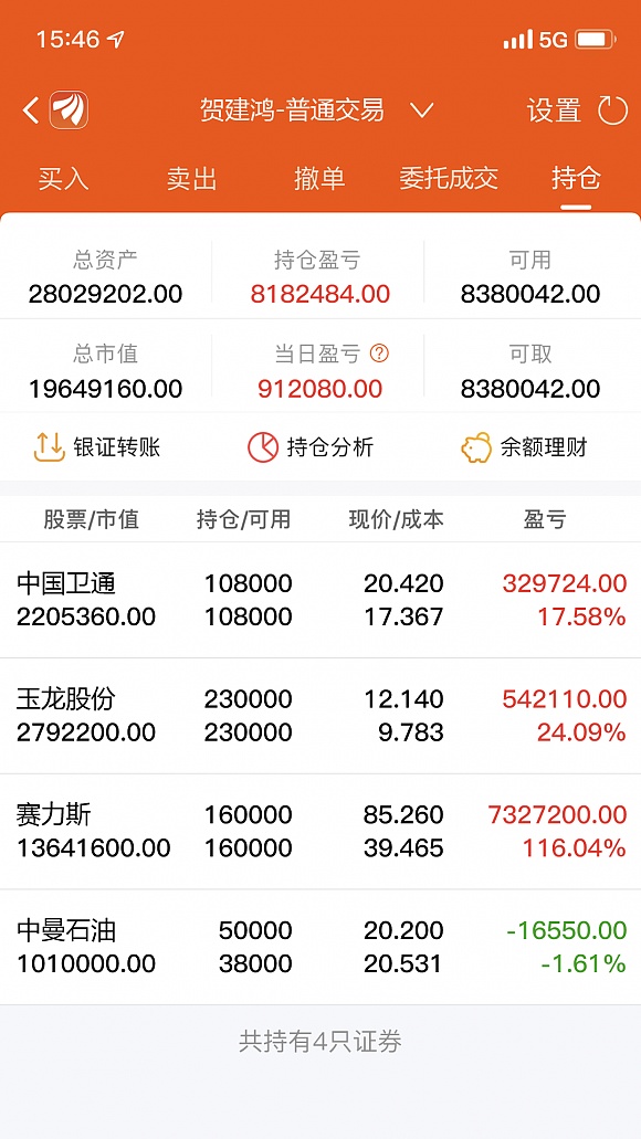 最近贺建鸿还在圈子里公开了自己手中持有的股票,因常推票常涨停而深受广大股友的爱戴。其推票盈利高而走红还被股民尊称为“亲民股神”。近期被人爆料已有众多股友追随,其部分追随者股票账户已逾千万以上,目前追随者也达上万,据追随者透露, 跟进他推的票大多盈利可达到30%以上。