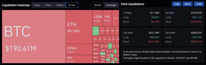 加密市场突然迎来大行情波动,让过去24小时有高达84482名投资者面临清算,比特币共爆仓超1.9亿美元、以太坊爆仓超5120万美元,全网爆仓超3.5亿美元,其中又以空军死伤最惨重占2.75亿美元。