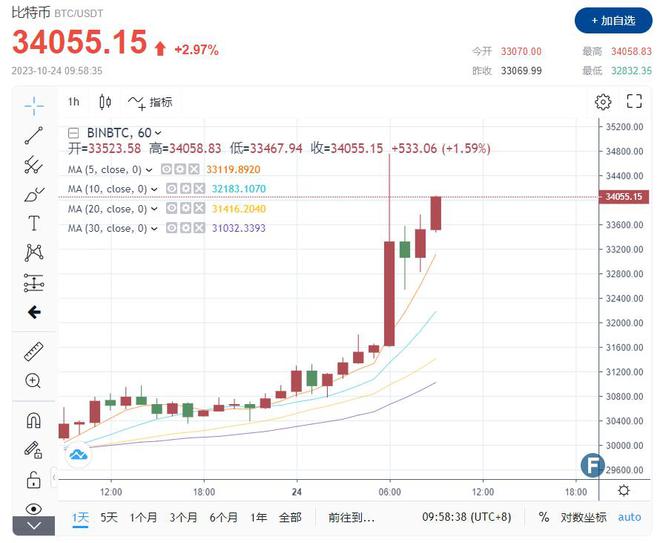 就在北京时间周二清晨6时30分左右,比特币突然从32000美元左右爆拉超过2000美元,币安比特币现货数据一度来到34741美元,近24小时上涨近10%。