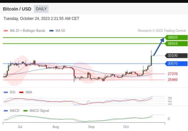 “我们的枢轴点位于30570美元,偏好是只要30570美元是支撑位,上涨空间就占上风。另一种情况,下行突破30570美元将寻求27370和25460美元。”