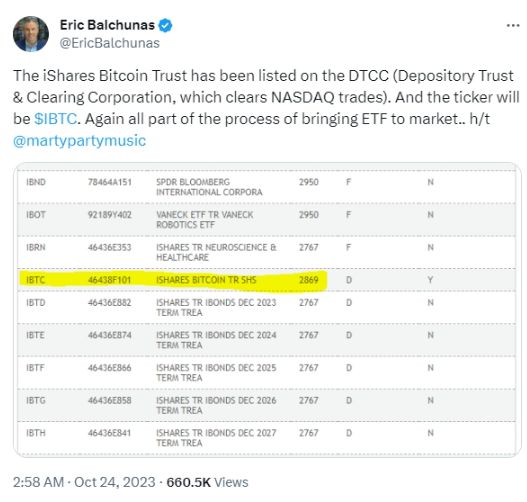 针对比特币这波爆拉的原因,加密社群纷纷推测,很可能与比特币现货ETF的利好消息相关。Eric Balchunas在推特上写道:“他们(贝莱德)要么从美国证监会获得了上市的信号,要么只是想准备好一切。我们仍然认为,多个ETF发行商会同时获得批准。”