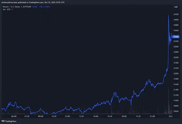 根据TradingView的数据,比特币在世界协调时周一22:00的交易价格为31,629美元,在接下来的40分钟内飙升至34,140美元。
