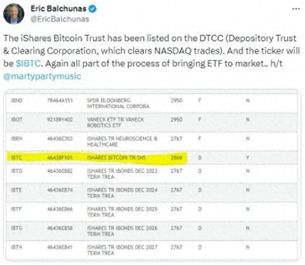 关于BTC价格急升的原因,加密社群中出现了各种猜测,许多人认为与BTC现货ETF的积极消息有关。Eric Balchunas在Twitter上表示:“贝莱德要么已经获得了SEC的上市批准信号,要么只是在做好准备。我们仍然相信,可能会有多个ETF发行商同时获得批准。”