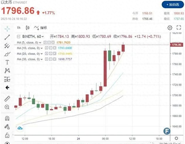 ETH的价格也在大致相同的时间内上涨到了1,800$左右,24小时内上涨约6%。