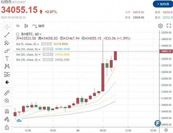 在北京时间周二早上6:30左右,BTC价格突然暴涨,从约32,000$上升至超过2,000$,BNB BTC现货数据一度达到了34,741$,24小时内上涨近10%。与此同时,BTC期货市场波动更为激烈,受到大量空头头寸的爆仓影响,最高价格一度达到了35,918z$。