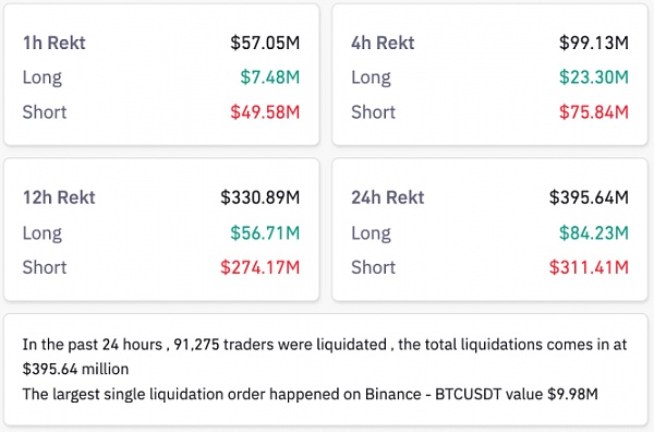 Coinglass 的数据显示,过去一天有超过 91,200 名交易者被平仓,空头平仓价值超过 3.1 亿美元。