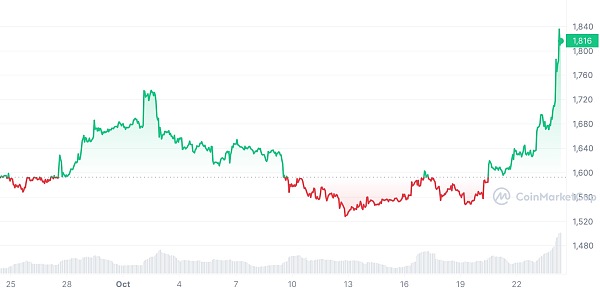 虽然比特币的价格达到 35,000 美元,为 2023 年的最高水平,但山寨币之王以太坊 (ETH) 突破了 1,800 美元,价值上涨了 8%。这位山寨币之王的下一步目标是 2,000 美元。从目前的走势来看,以太坊自年初以来的涨幅已超过50%。