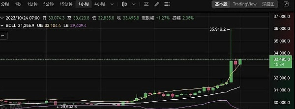 比特币现货ETF进展带来了市场的狂热,比特币价格一夜间大幅上涨。据行情数据显示,比特币短时间内突破了35000美元,最高达到了35919美元,创下了20%的日内涨幅。即使计算当前价格,24小时涨幅还达到了11.38%。