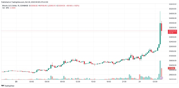 贝莱德的比特币现货 ETF 获得出生证明,而该公司可能会注入现金作为初始资产。这一消息引发了市场的大幅上涨,比特币的交易价格迅速超过34,000美元。