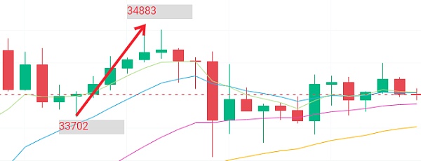 大盘经过了过去一周的放量拉升行情,当前位置短期有回调需求,4小时级别有回调的需求,当然无法确定是回撤还是以时间换空间,如果是回撤的话,下方的支撑在32000附近,如果出现支撑信号, 那将是再次布局中长线多单的好机会。