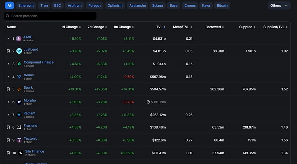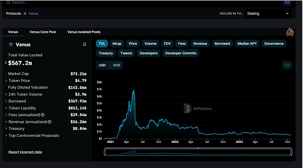 Venus 协议正在根据 Code4rena 和 OpenZeppelin 审计的最新建议进行一些调整。现在正处于微调&测试阶段!Venus Prime 计划的实施时间将很快确定,目前仅有 500 多个独立地址符合 Venus Pime 的资格。Venus 熊市中数据依然亮眼根据 DeFiLIama 的数据显示,借贷赛道排名前五的协议分别是 AAVE、JustLend、ComPound、Venus、Spark。Venus 作为 BNB Chain 排名第一的借贷协议,在整个链上借贷赛道也是名副其实的头部产品。峰值时,Venus 的 TVL 高达 70 多亿美元,即使在熊市中,仍然保持 5.67 亿美元的 TVL,这种规模的资金量超越了大多数公链整条链上的 TVL。