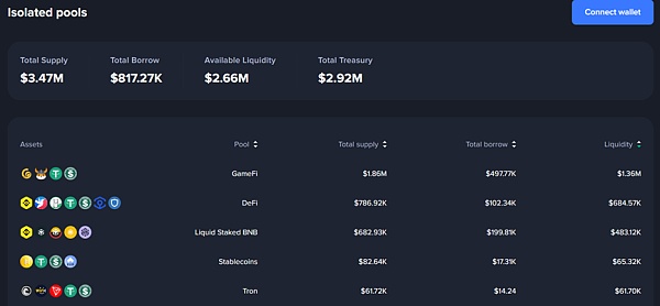 在风险管理方面, Venus 采用了弹性喂价策略,可同时利用多个价格来源,其中包括 Chainlink、Pyth Network、Binance Oracle、RedStones 和 TWAP 预言机,来确保代币价格的正确性。这种弹性喂价策略不仅保证了代币的精确价格评估,也为寻求进入 DeFi 领域的机构投资者铺平了道路。这样高精度和冗余是其他项目难以做到的,但 Venus 实现了!隔离池为市场带来更多流动性隔离池是 Venus V4 中的一项新功能,旨在克服单核池的限制。每个隔离池都是具有自定义风险管理配置的独立资产集合。这一设置使用户能够更好地管理风险并赚取收益,同时还可以防止一个市场的失败影响其他市场。隔离池有助于确保单⼀资产的故障不会影响整体资产组合的风险。在这种情况下,风险仅限于受影响的特定资产或同⼀隔离池中的其他资产。由于风险被隔离,因此可以将流动性较低且可能存在较⼤波动性的加密资产(长尾代币)与核⼼池分隔开来。推动隔离池的直接影响之一是用户参与度的激增。由于隔离市场的上市&上架新的长尾代币的过程是非常去中心化且透明的,因而让 Venus 的用户有很扎实且深度的参与感。