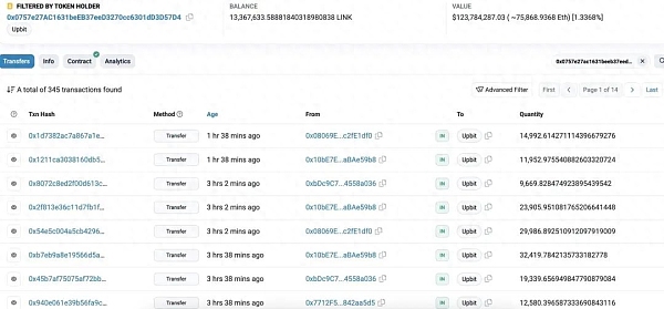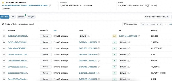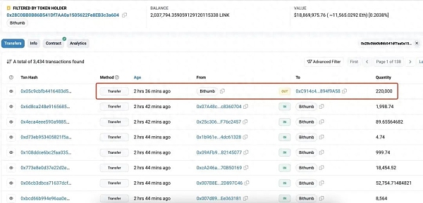 Bithumb 已经停止了对 $LINK 的收购,并在 2 小时前转增了 22 万 $LINK(价值 205 万美元)。随后,$LINK 的价格也开始从最高点下跌。这表明 Bithumb 对 $LINK 价格的行动产生了影响。