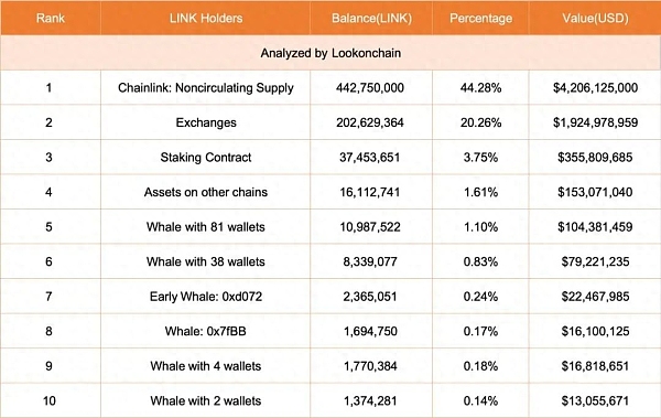我们对$LINK的持有者进行了分析。交易所持有2.026亿$LINK(价值19亿美元),占总供应量的20.26%。持有者共抵押了3.7亿$LINK(3.558亿美元)此外,我们还发现了许多$LINK的大型鲸鱼。