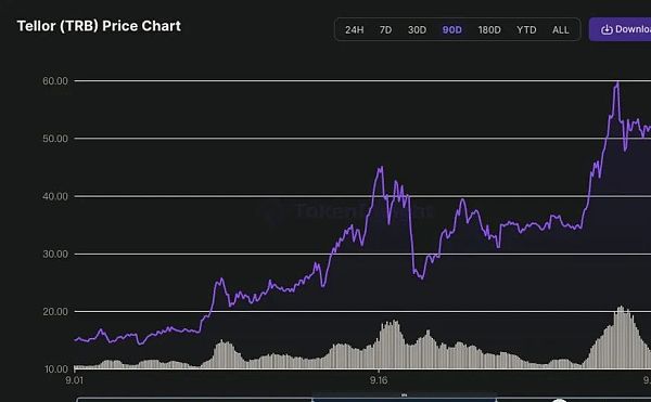 TRB 最初的暴涨开始于 2023 年 9 月。根据 TokenInsight 的数据,TRB 的价格自 9 月 7 日开始明显上涨,在一周内从十几美元一路飙升至最高 45 美元,并最终于 9 月底超过 60 美元,单月涨幅高达 275%。