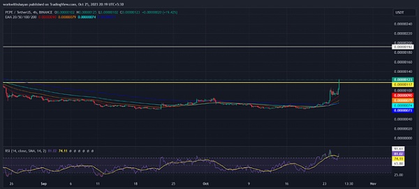 20 日均线目前为 0.0000009 美元,开始攀升,RSI 正在穿越超买区域。这些指标表明看跌立场正在减弱。Pepe 价格有可能攀升至 0.0000019 美元,此时空头可能会试图阻止进一步上涨。
