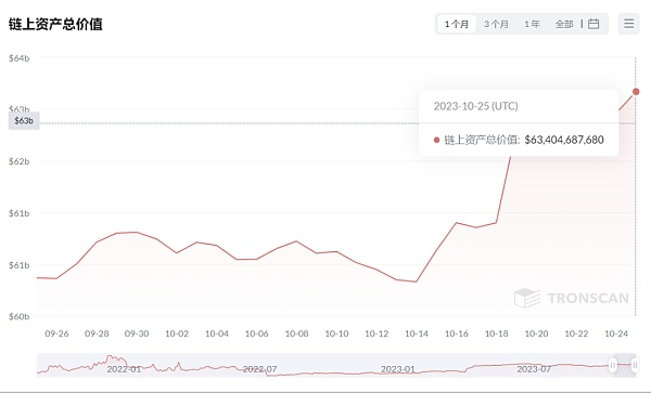 据区块链浏览器TRONSCAN数据,截至10月25日,波场链上资产总价值为63,404,687,680美金,超过634亿美金。