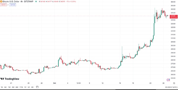 近两周,比特币价格大幅上涨,甚至在10月24日突破了35,000美元,创下自2022年5月以来的新高。许多专家认为,这种兴奋与现货比特币ETF的批准密切相关,预计将引发机构新一轮的购买浪潮。