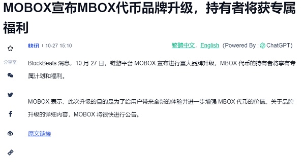 MBOX已经在底部盘整1年多的时间,近期MBOX有明显的放量拉升动作,基本面也有相应的利好,即将进行品牌升级,底部吸筹动作明显,很有可能在短时间内冲击新高的可能,可以密切关注项目最新进展