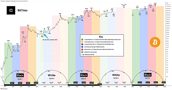 根据上一次 BitTime 白色周期,2023 年比特币将从 8 月的黄点触底:这也是吗?