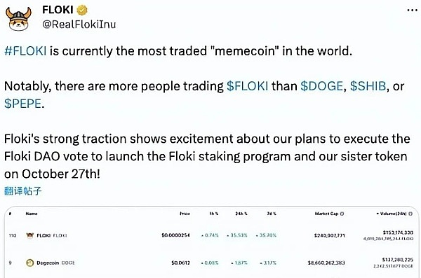 最近,Floki官方发布了一则推文,声称$FLOKI的交易人数超过了$DOGE、$SHIB或$PEPE的交易人数。此外,他们还宣布将于10月27日执行Floki DAO投票以启动Floki质押计划,这无疑将引发一波新的关注。
