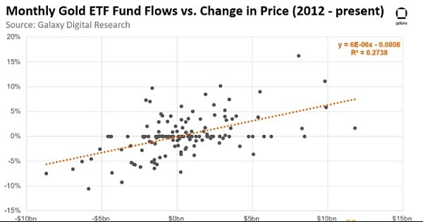 如果我们将第一年144亿美元的估计流入量(每月约12亿美元,或根据8.8倍的调整系数约为105亿美元)应用到黄金ETF资金流和金价变化之间的历史关系中,我们可以预计在比特币价格上的影响在第一个月将增加6.2%。