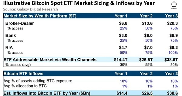 我们的假设是,RIA渠道将从第1年的50%开始逐渐增长,并在第3年达到100%。对于经纪自营商和银行渠道,我们预计增长速度会较慢,从第1年的25%开始,并在第3年逐渐增加至75%。根据这些假设,我们估计美国比特币ETF在推出后的第1年可能达到潜在市场规模约为14万亿美元,第2年约为26万亿美元,第3年约为39万亿美元。