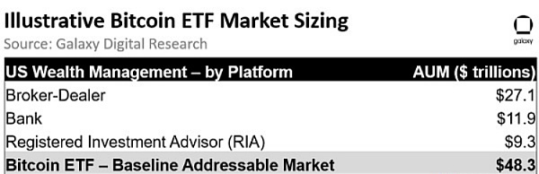 鉴于上述可访问性因素,美国的财富管理行业可能是最有潜力的市场,通过获批的比特币ETF,将获得最大的资本准入机会。截至2023年10月,经纪商(27万亿美元)、银行(11万亿美元)和注册投资顾问(RIA,9万亿美元)管理的资产总额达到了48.3万亿美元。