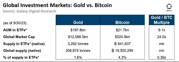 与比特币相比,黄金的市值估计高出约 24 倍,鉴于投资工具中的比特币供应量减少了36%,因此我们可以假设,与黄金市场相比,相同金额的美元资金流入将对比特币市场的影响大约是8.8倍。