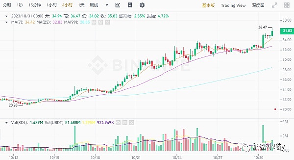 33.90 美元突破:SOL/USDT 货币对于 10 月 30 日恢复上涨趋势,突破了 33.90 美元的水平。
