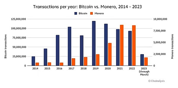 下图将 XMR 交易与比特币 (BTC) 交易进行了比较。自 2014 年以来,BTC 交易总数约为 7.9 亿,而 XMR 交易总数约为 3200 万。自 2014 年以来,XMR 的使用量一直在增长,并在 2021 年达到峰值,约为 880 万笔交易。