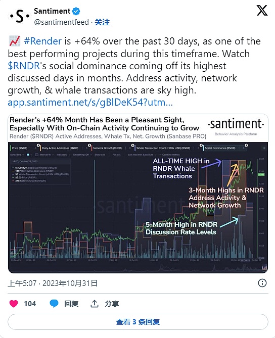 链上分析平台 Santiment 能够确定 Render 在上述期间呈指数增长的原因。据 Santiment 称,RNDR 是网络增长、活动和鲸鱼互动增加的受益者。由于这些活动,代币的社会主导地位在同一时间范围内达到了最高点。